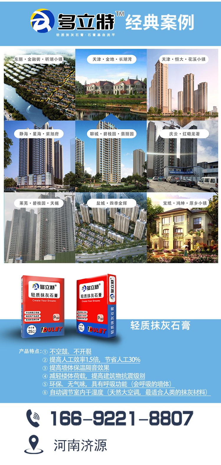 多立特天津廠區(qū)成立于2009年,公司于2012年開(kāi)始駐足于石膏產(chǎn)品的研發(fā),目前室內(nèi)石膏產(chǎn)品已相當(dāng)成熟及穩(wěn)定,公司于2019年成立多立特山東廠區(qū),以便發(fā)展壯大室內(nèi)石膏事業(yè)而努力,現(xiàn)為了開(kāi)拓南方市場(chǎng)特臨近原材料區(qū)成立濟(jì)源多立特新型建材有限公司。